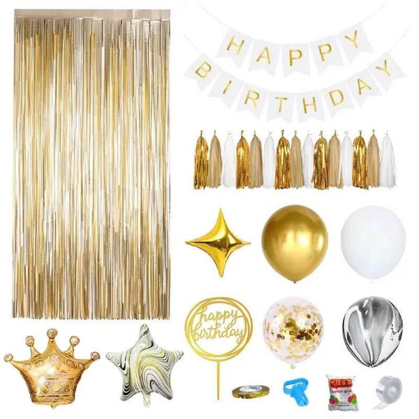 60 кульок різних кольорів; 1x кулька у формі корони; 2x кульки у формі п’ятикутної зірки; 2x кульки у формі чотирикутної зірки; 1x штора з блискучих стрічок; 1x напис Happy Birthday; 5x набори кольорових декоративних помпонів; 1x прикраса для торта Happy Birthday; декоративна стрічка, аксесуари для зв’язування кульок, клей та клейка стрічка для кріплення кульок.