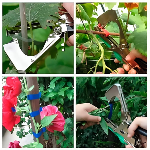 Просто натисніть на ручку, щоб витягнути стрічку між щипцями. Потім стрічка обертається навколо рослини, яку ви хочете зв’язати. Натисніть на ручку знову, щоб натягнути та відрізати стрічку. Дуже просто! – не хвилюйтеся про пошкодження ваших рослин або про те, що вони відчувають біль, оскільки стрічка та степлер забезпечують ніжне, але міцне утримання.
