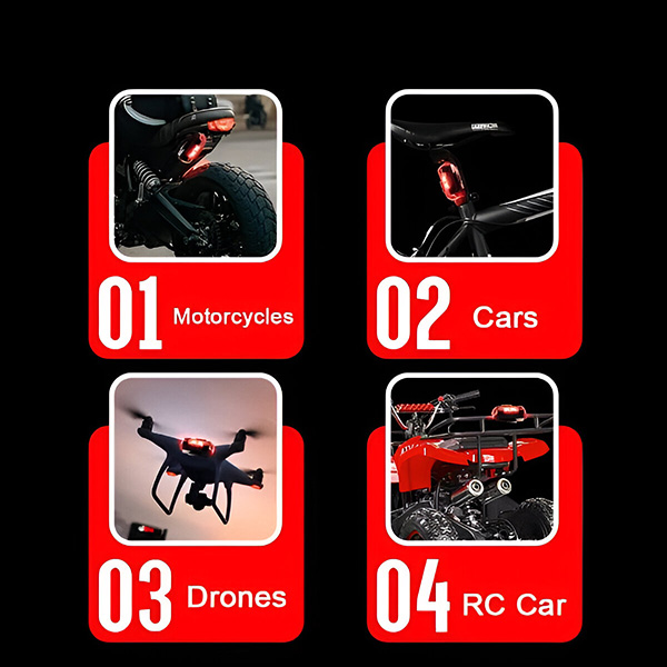 Ці ліхтарі надзвичайно універсальні і розроблені для використання в автомобілях, мотоциклах, велосипедах і дронах. Ви можете вибрати методи установки за допомогою липучки або гумового кільця для простої та надійної установки. Не потрібно складних інструментів або професійної допомоги.